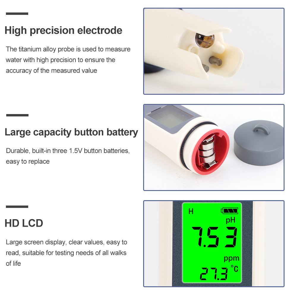 • 3-in-1 multifunction design measures Temperature, TDS, and pH simultaneously