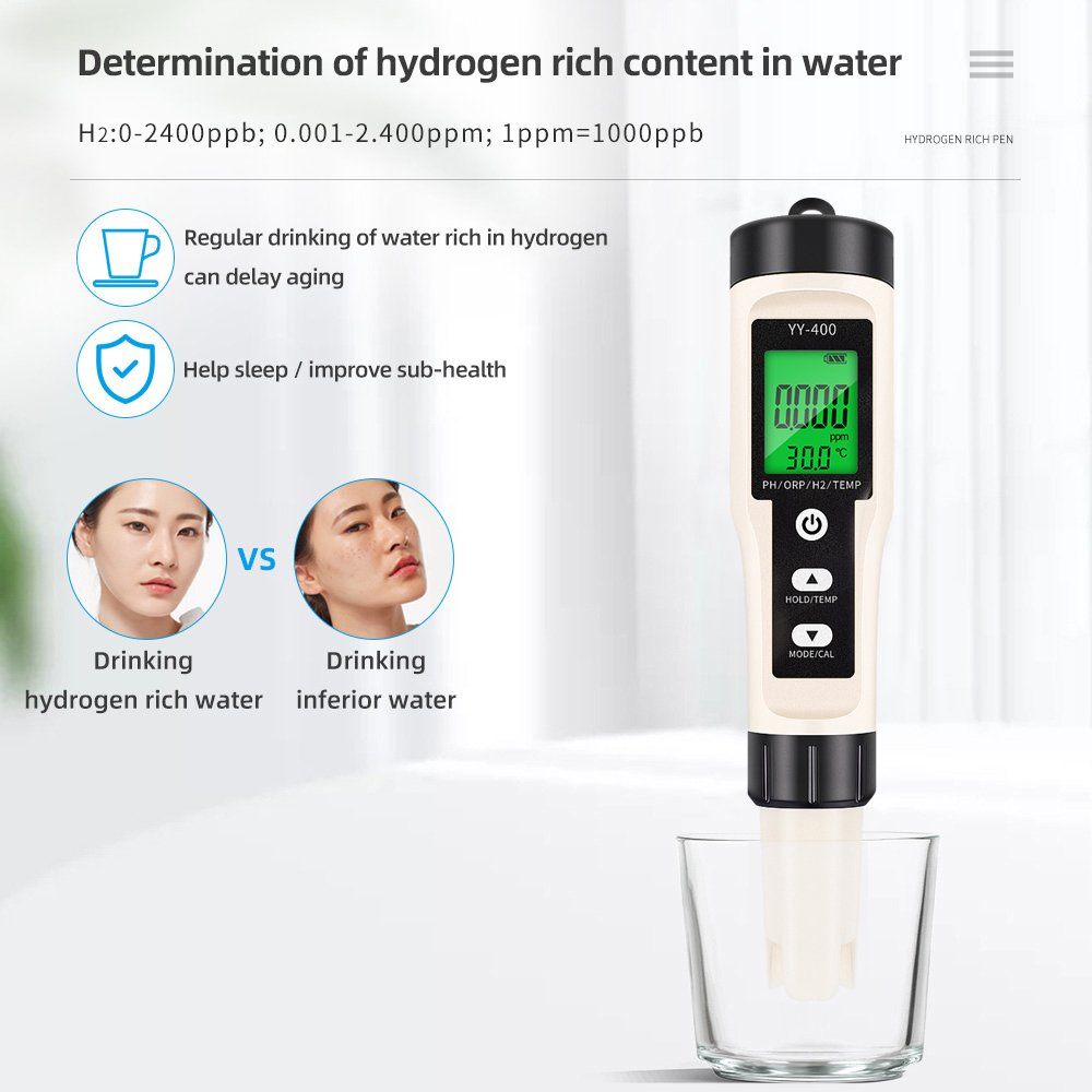 Introducing the ultimate tool for health enthusiasts and professionals—the 4-in 1 Hydrogen-Rich Water Quality Meter, designed to measure Temperature, ORP (Oxidation-Reduction Potential), pH, and dissolved Hydrogen (H2) levels with unmatched accuracy. This advanced device empowers you to verify the purity and potency of hydrogen-rich water, ensuring every sip delivers the antioxidant benefits you seek. Whether you’re testing alkaline water from ionizers, hydrogen water generators, or bottled water, this meter provides reliable, laboratory-grade results in seconds.