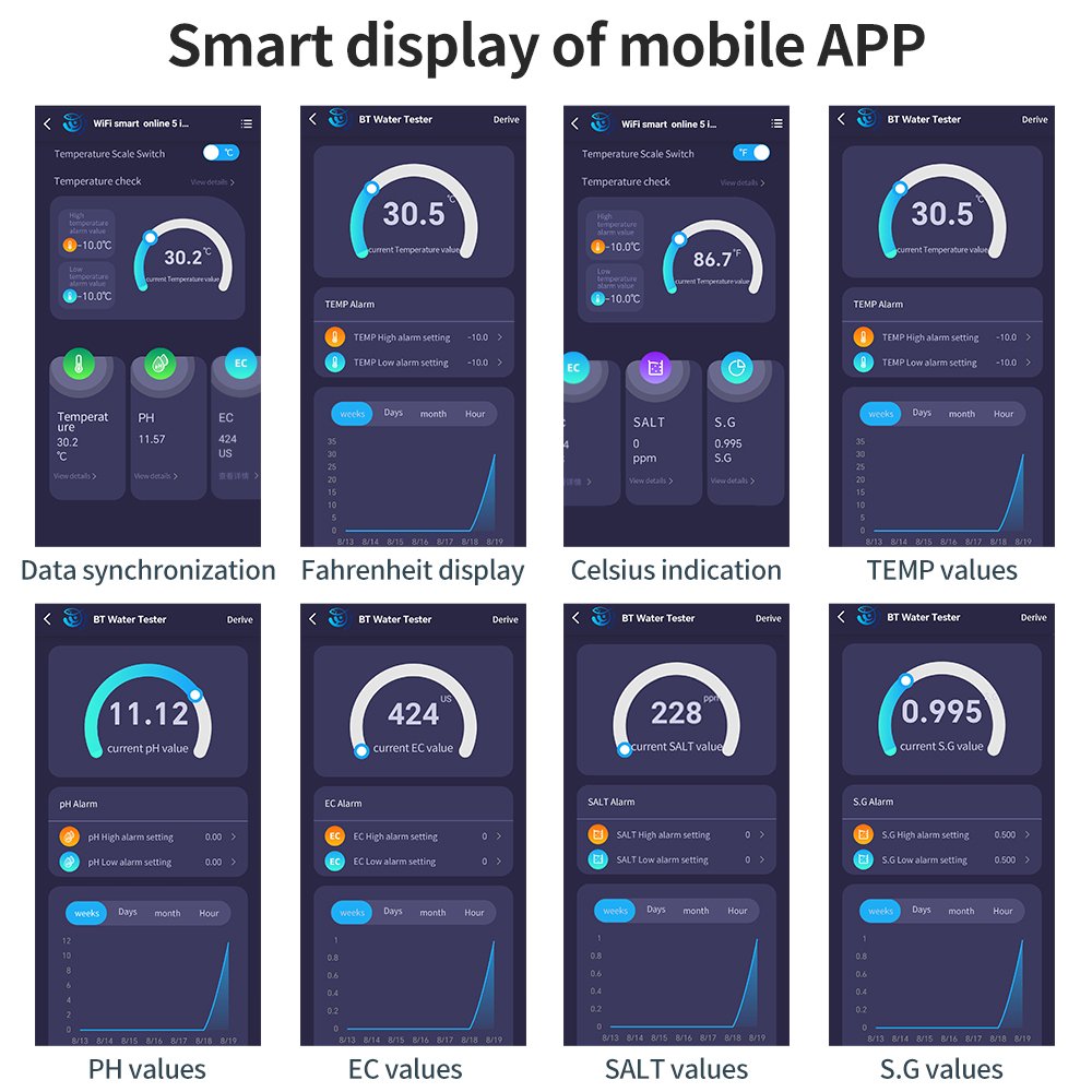 Gone are the days of juggling multiple instruments. With a simple probe dip, obtain rapid and accurate readings of your water’s vital parameters. Monitor the acidity/alkalinity balance with the pH function, assess the total ion concentration via EC, and get a direct reading of salt content with dedicated Salinity and Specific Gravity modes—all while automatically compensating for temperature to ensure unmatched accuracy across readings.