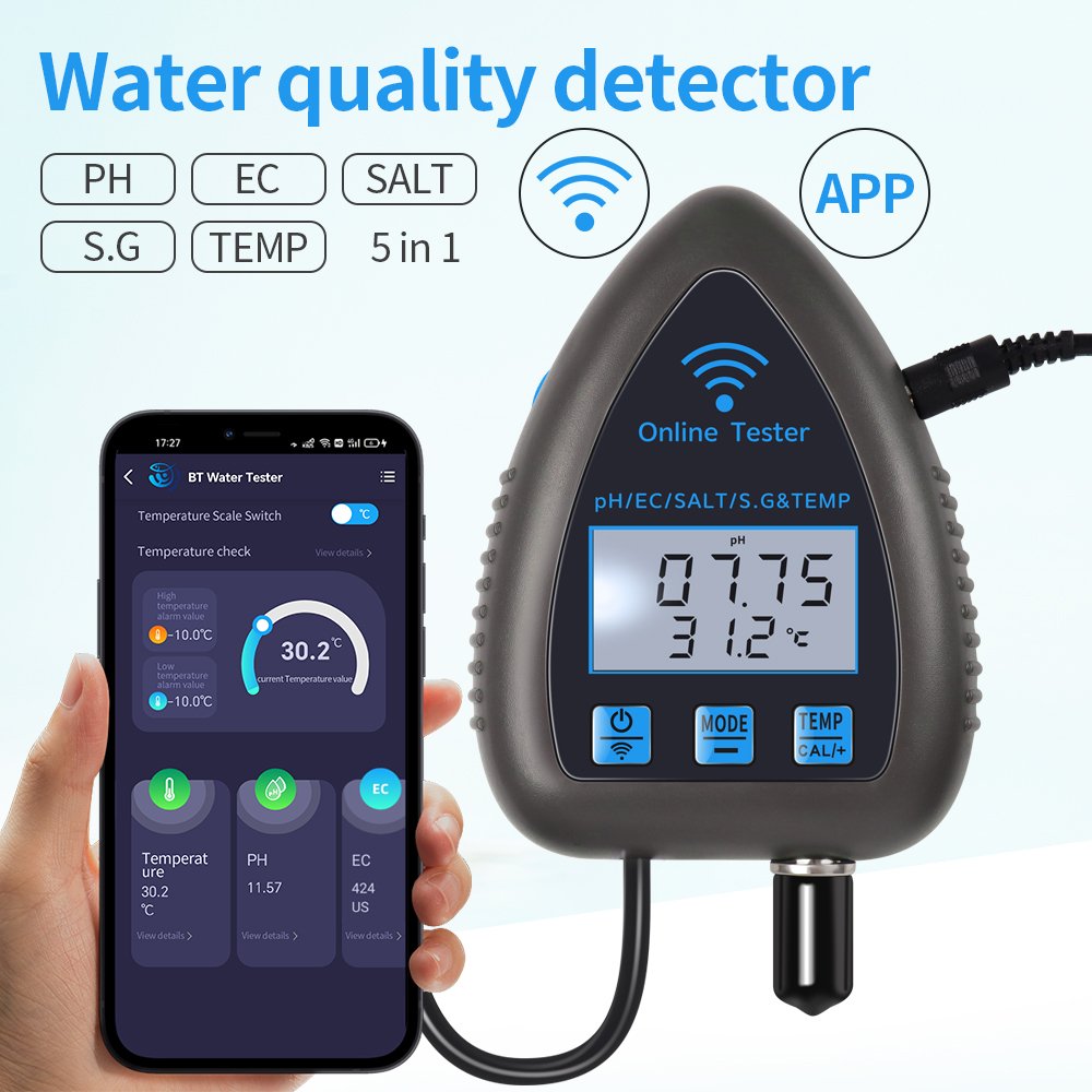 Elevate your water quality management with our advanced 5-in-1 Digital Mariculture Tester, the all-in-one solution designed for aquaculture professionals, marine biologists, and serious aquarists. This robust tool seamlessly integrates five critical measurements into one handheld device: pH, EC (Electrical Conductivity), Specific Gravity (S.G), Salinity, and Temperature.