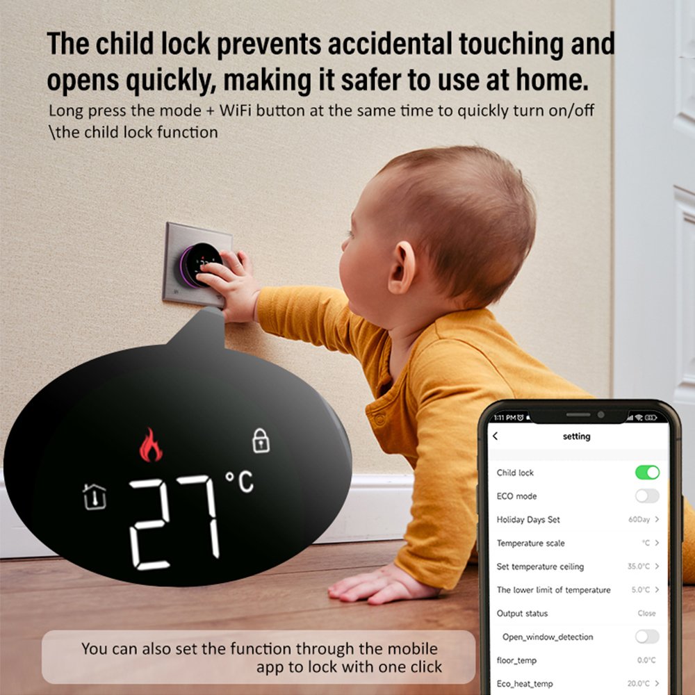 The thermostat supports flexible programming for daily or weekly heating cycles, helping optimize energy efficiency and reduce costs. Additional intelligent features such as open window detectionfrost protection, and child lock enhance both safety and convenience.