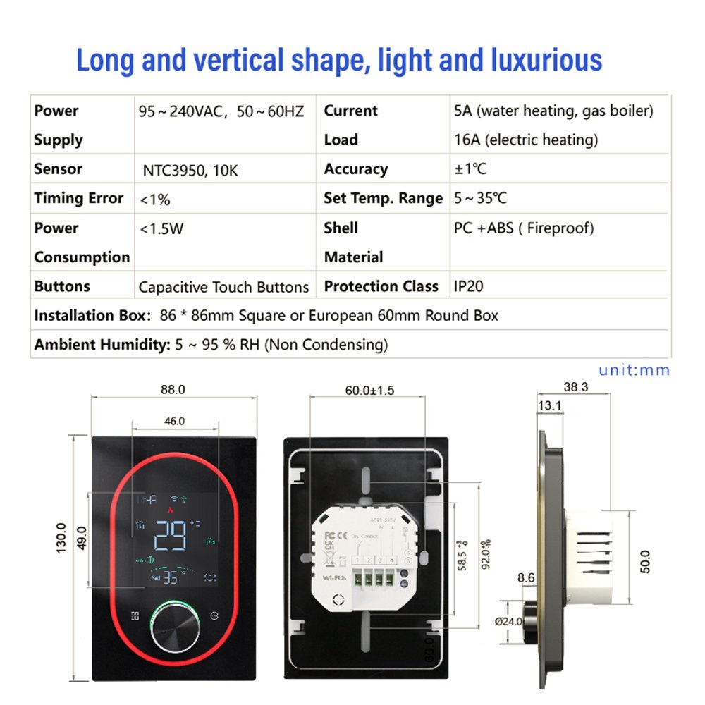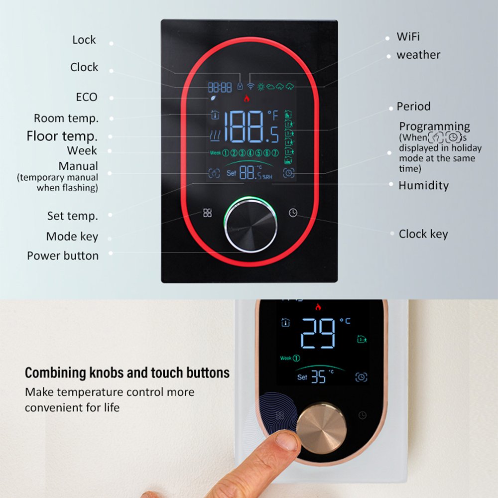 Featuring a tactical rotary knob for effortless temperature adjustment, this thermostat maintains the familiar manual operation users prefer while adding cutting-edge smart capabilities. The built-in WiFi connectivity enables seamless remote access through a dedicated mobile app, allowing users to monitor and adjust heating settings from anywhere at any time. Whether you’re in bed or away from home, full control remains at your fingertips.