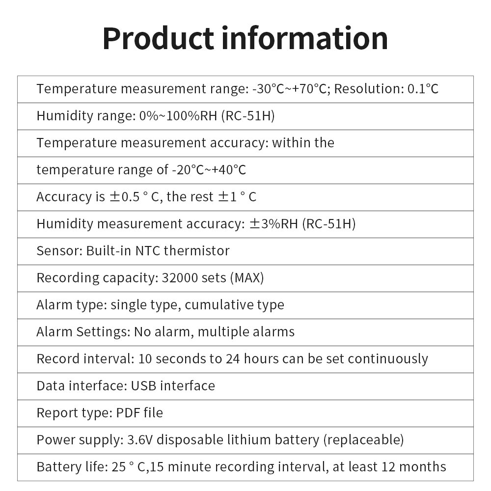 The device combines robust functionality with user-friendly operation. Its clear LCD display provides instant visibility of current temperature, minimum/maximum values, and battery status, while the intuitive one-button operation simplifies field use. The RC-51H features programmable start delays, adjustable sampling rates from 10 seconds to 24 hours, and configurable alarm thresholds with visual and audible alerts. Water-resistant construction ensures reliable performance in challenging environments, making it suitable for various industrial and logistics applications.