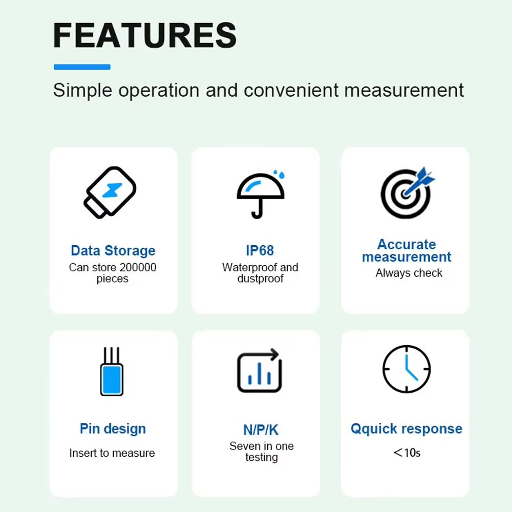 The Soil Parameter Detector is a professional, efficient tool designed for accurate soil analysis, widely used in laboratories, agricultural research, horticulture, and environmental monitoring. It provides quick, reliable measurements of key soil parameters, including moisture content, pH level, electrical conductivity (EC), and essential nutrient concentrations (NPK), supporting scientific decision-making in various fields.